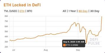 Как видно из графиков DefiPulse, "капитализация" DeFi в долларах завалилась в первую неделю сентября сразу на 40%. Далее последовала коррекция ко 2-ому (пока что) уровню Фибо - во-первых, курс ETH/USD также начал корректироваться после 7-го сентября; а во-вторых, видимо, как и в марте, многие лохи-"инвесторы" согласно DeFi-методичкам бросились спасать гарантийное обеспечение своих залогов, загоняя в лохотроны и пирамиды всё новые и новые средства. Нетрудно предугадать, что результат этих "героических" усилий будет таким же, как и ранее - помимо первичных вложений лошары спалят ещё и "спасательные" добавки.
