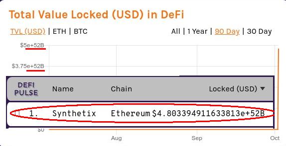 Итак, 2 октября график DefiPulse для объёма общих средств, закопанных заблокированных в DeFi, на продолжительное время превратился в супер-spike. Согласно статистике сервиса лидером DeFi-сектора в одночасье стала платформа деривативов Synthetix с объёмом заблокированных в ней средств в размере ... почти 5х1052 миллиардов USD. Чтобы оценить всю фантастичность этой величины - скорее всего, количество атомов, из которых состоит планета Земля, во много-много раз меньше. Опять же в языках программирования C/C++ максимально возможное значение для переменной целочисленного типа unsigned long long не превышает 1020. Понятно, что к сюр-значению в 5х1061 долларов DefiPulse приехал на бесконечном цикле и упёрся в лимиты архитектуры amd64. Остаётся только выяснить вопрос, супер-ошибка в логике на чьей стороне - DefiPulse или Synthetix - привела к такому результату.